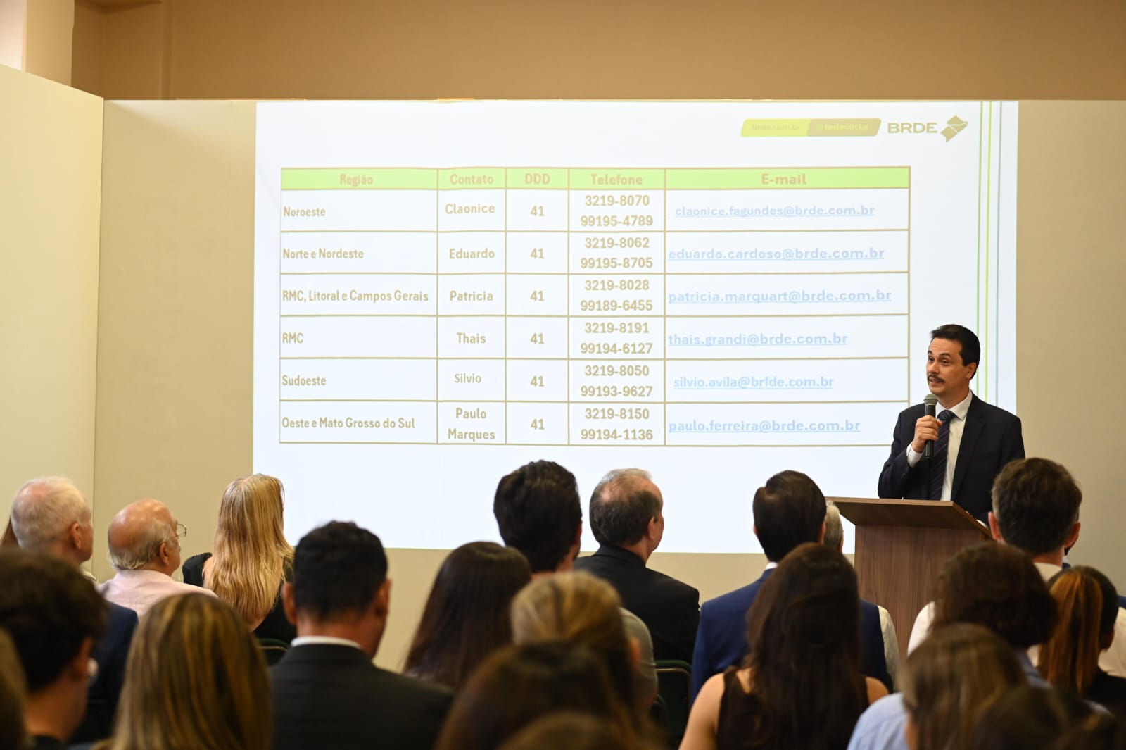 Ao longo da programação, o superintendente do BRDE no Paraná, Paulo Starke, apresentou números e indicadores da atuação da instituição no Estado. Entre os pontos destacados, estiveram o pioneirismo do banco na captação por Letras de Crédito do Desenvolvimento (LCDs), a estratégia de diversificação das fontes de funding e a presença territorial das operações de crédito, hoje distribuídas em 96% dos municípios paranaenses.