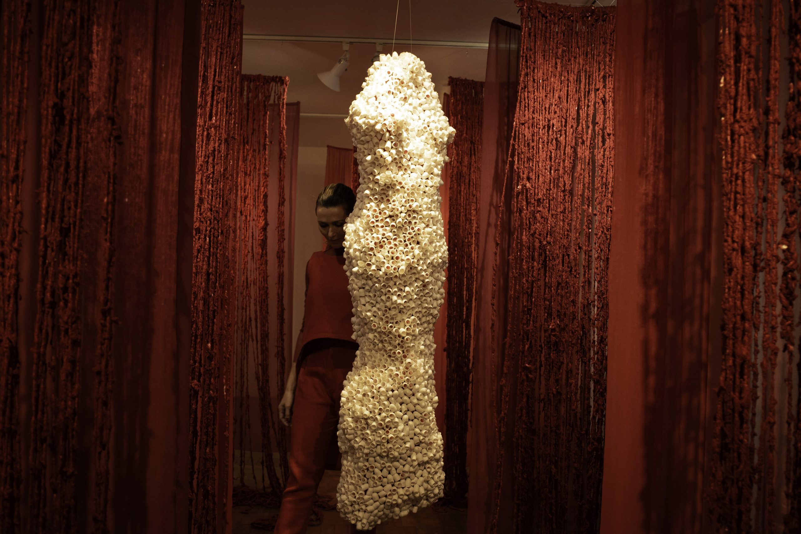 A exposição será composta de duas instalações esculturais em grande formato. As obras utilizam materiais naturais menos convencionais: fio de seda, voal de seda, casulos de bicho-da-seda e raízes de árvore, formando grandes esculturas e cortinas suspensas nos espaços expositivos. O público poderá andar entre as próprias obras, que conectam diferentes ambientes do Palacete, entre a Sala 2 e a Sala da Torre.
